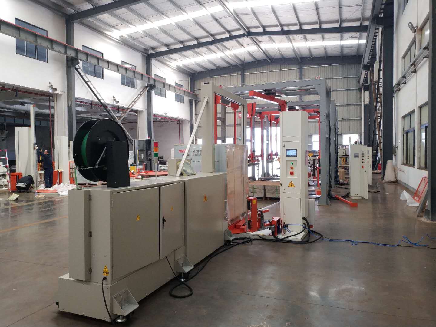 將托盤貨物放到纏繞機(jī)圓盤上后,按啟動鍵進(jìn)行全自動打包(縱橫2條行程井字形,共計(jì)4條)打包好后進(jìn)行托盤纏繞,自動纏繞包裝好后會有報(bào)警提示音人工用叉車下貨入庫完成整個(gè)流程。