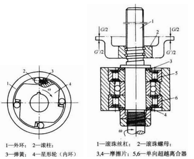 當要防止滾珠絲杠副在兩個方向上反轉時,可以采用圖2所示的結構。在圖中,G表示作用在滾珠螺母2組件上的重力,G'表示作用在組件2上的平衡力。當G-G'>0時,摩擦片3和單向超越離合器5用作制動器,從而防止滾珠螺母2向下移動;當G-G′<0時,摩擦片4和單向超越離合器6起制動器的作用,防止滾珠螺母2向上運動。