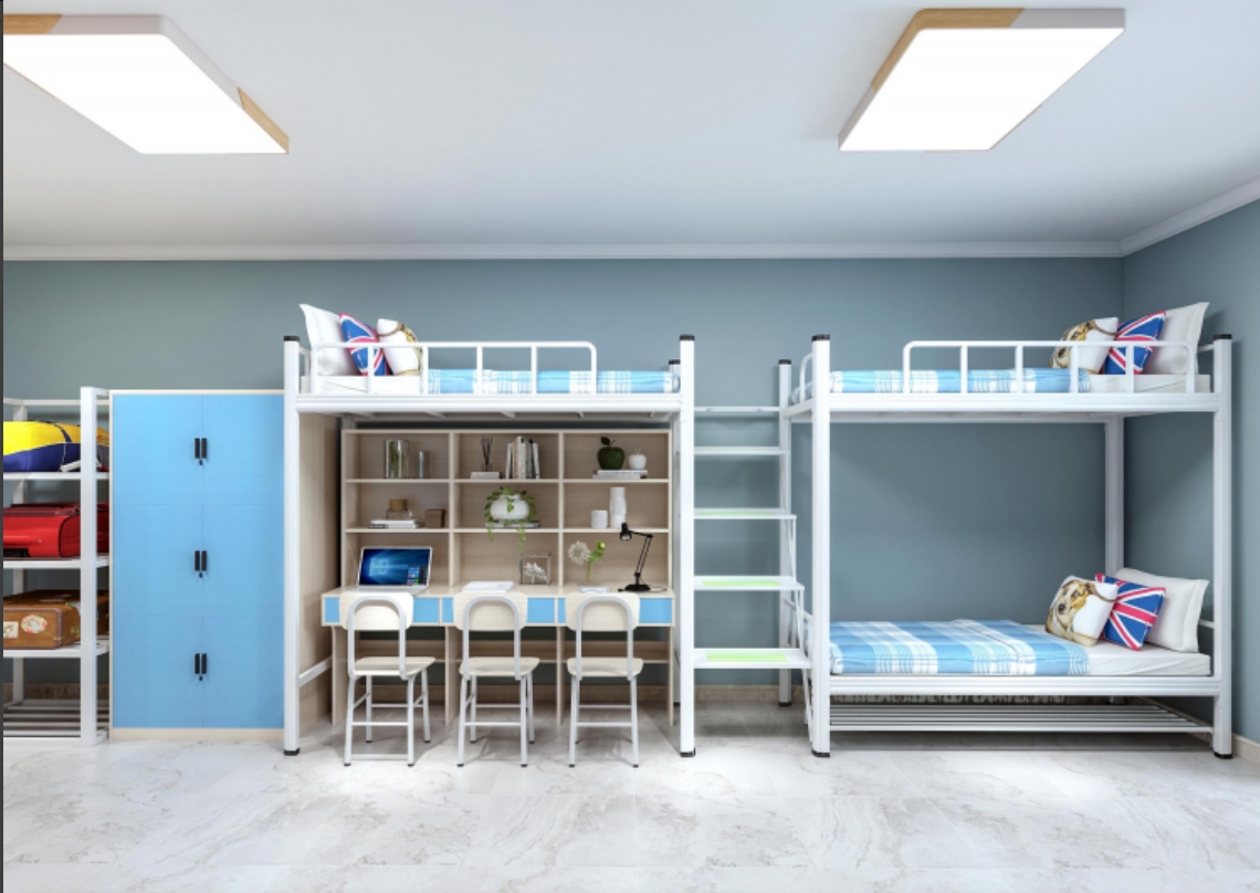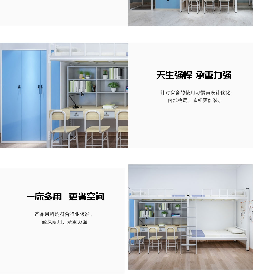 二連3人位公寓床1.整體規格:L4110*W900*H2120mm/2900mm,;2.邊立柱:采用(V65閉口型材),料厚1.2mm的閉口型管材,立面8個。立柱上下兩端口安裝工程塑料靜音內塞,上端內塞...
